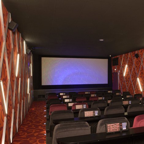 Vines on floor and wall coverings winding through well-lit trellises and the newly installed platform system and love seats lend new charm to Auditorium 2 in the Regina 2000 Cinema in Ellwangen. Improved sightlines, functional, energy-efficient yet atmospheric lighting and a hidden projection screen round out the familiar service at your seat.