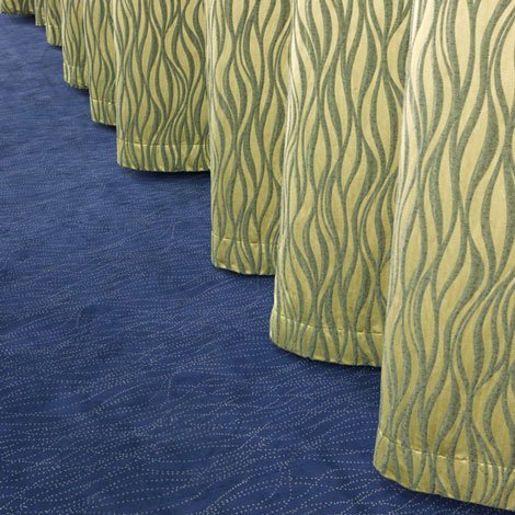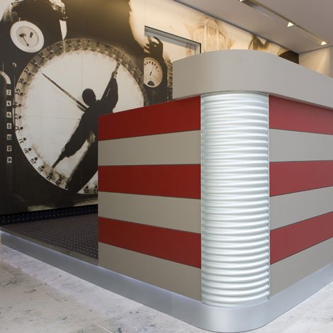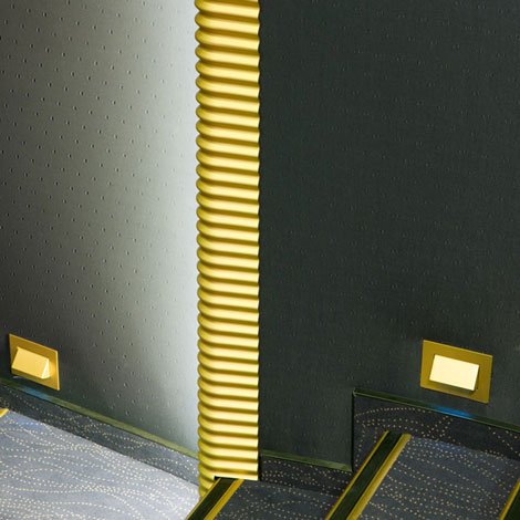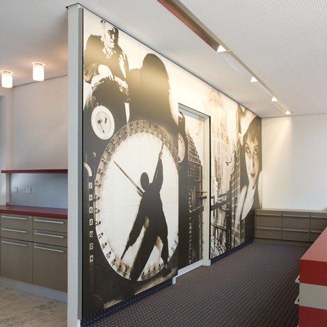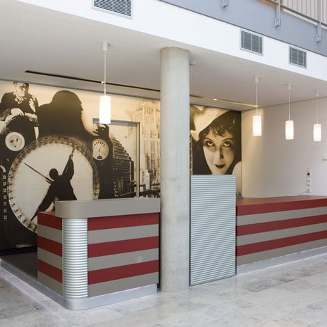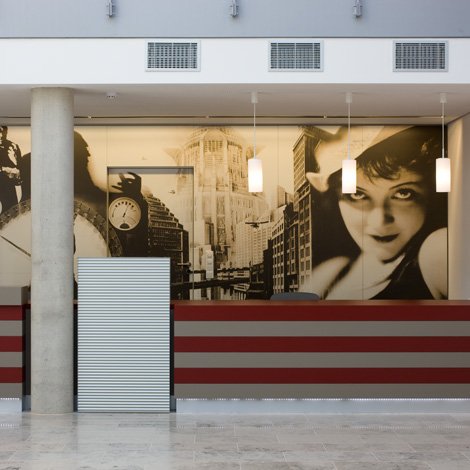 Beim Betreten der großzügigen Empfangshalle ziehen einen sofort die Schwarz-Weiß-Motive hinter der Theke in Bann, eine Collage klassischer deutscher Filmgeschichte. Links die Kinokasse, abgesetzt vom rechts angeordnetem Empfang, werden verbunden mit kräftigen roten Blockstreifen. Im Kinosaal dominieren die Wiesbadener Stadtfarben: dunkles Blau und goldfarbene Schmuckelemente. Zum Vorhang passend wurde das Teppichmuster entworfen.