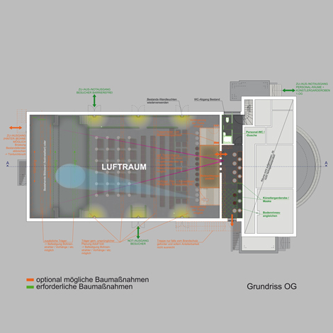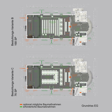 Das Entwurfskonzept enthält mehrere optional mögliche Baumaßnahmen, welche einerseits die Einhaltung verschiedener Budgets gewährleistet, andererseits jedoch auch zahlreiche Optionen offen hält, die geschaffene Mehrzwecknutzung der Räumlichkeiten künftig noch verfeinern zu können.