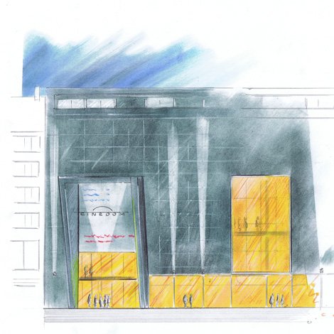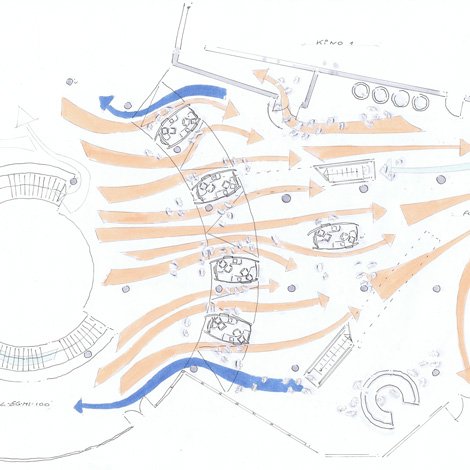 Die versetzte Anordnung der 14 Kinosäle in der L-förmigen Baulücke, bewirkt rückwärtig eine gestaffelte Fassade mit raffinierter Anordnung der Fluchttreppenhäuser. Zusammenhängende Bildwerferräume, kurze Wege für die Technik, ein Zentrum, um das sich alles dreht und eine selbsterklärende Wegeführung für die Besucher unterstützen das erfolgreiche Multiplex.